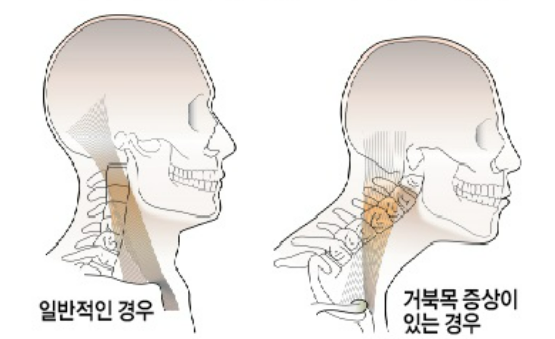 머리가 앞으로 튀어나오면서 목 앞쪽의 근육은 만성적으로 짧아지고 팽팽해지며, 뒤쪽의 근육은 약해지고 늘어납니다.